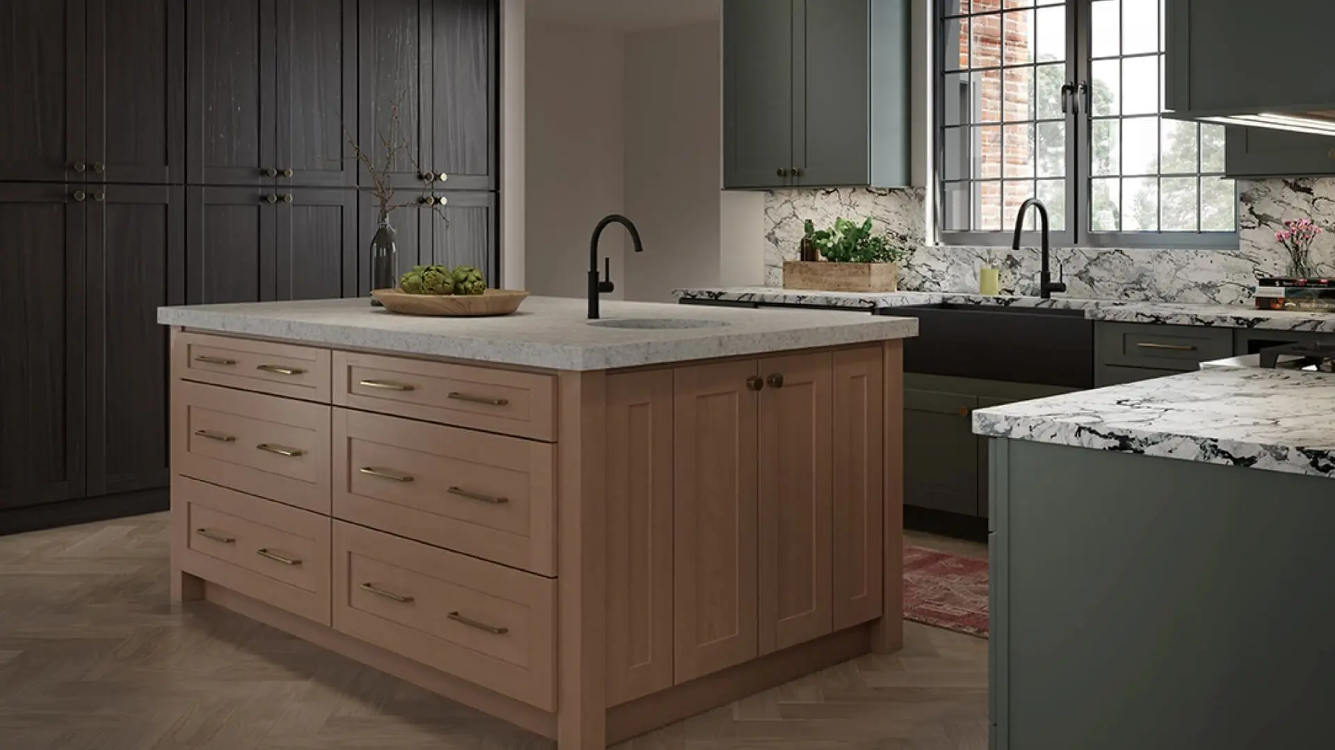The kitchen above was designed with cabinets in three different colors: Hunt, a classic hunter green (perimeter). Jute, a rich, medium-blond stain (island). Carbon, a nearly black stain (stacked cabinets). The dark stain keeps the wall of cabinets from overwhelming the space.